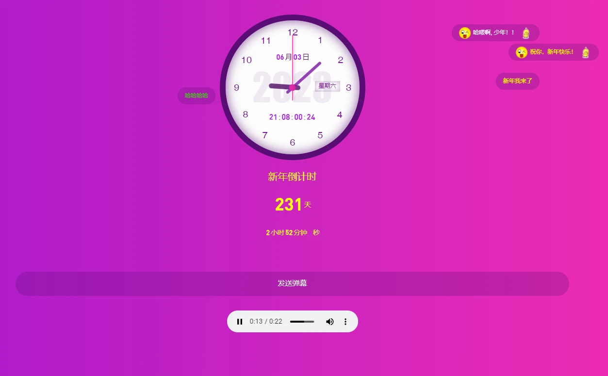 新年倒计时特效网页代码带背景音乐弹幕 点击复制链接到浏览器打开 演示地址: https://danwangge.github.io/love/6/ 下载地址: https://xnyy.lanzout.com/iM6Ef0y5pjpe